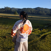 Camisa artesanal de manga larga confeccionada en manta 100%, fresca y ligera. Presenta estampado serigrafiado en las mangas y en la parte frontal. Una prenda de diseño contemporáneo con fuerte identidad gráfica, inspirada en la estética de los costales tradicionales.